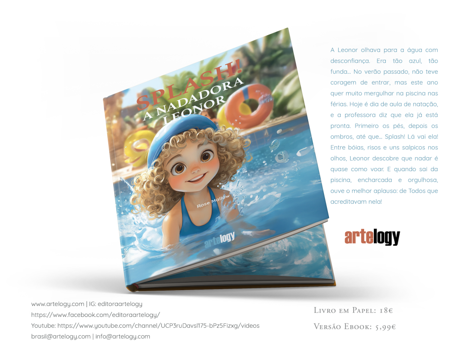 A Leonor olhava para a água com desconfiança. Era tão azul, tão funda… No verão passado, não teve coragem de entrar, mas este ano quer muito mergulhar na piscina nas férias. Hoje é dia de aula de natação, e a professora diz que ela já está pronta. Primeiro os pés, depois os ombros, até que... Splash! Lá vai ela! Entre bóias, risos e uns salpicos nos olhos, Leonor descobre que nadar é quase como voar. E quando sai da piscina, encharcada e orgulhosa, ouve o melhor aplauso: de Todos que acreditavam nela!